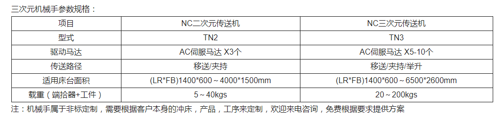 三次元機械手是一種適用于大噸位沖床沖壓生產(chǎn)中,講板料在多工序模具之間移送的傳送裝置,配合專用夾具可使工序沖壓件運送更加穩(wěn)定精確,可以滿足各種沖壓工序之間的傳送需求。